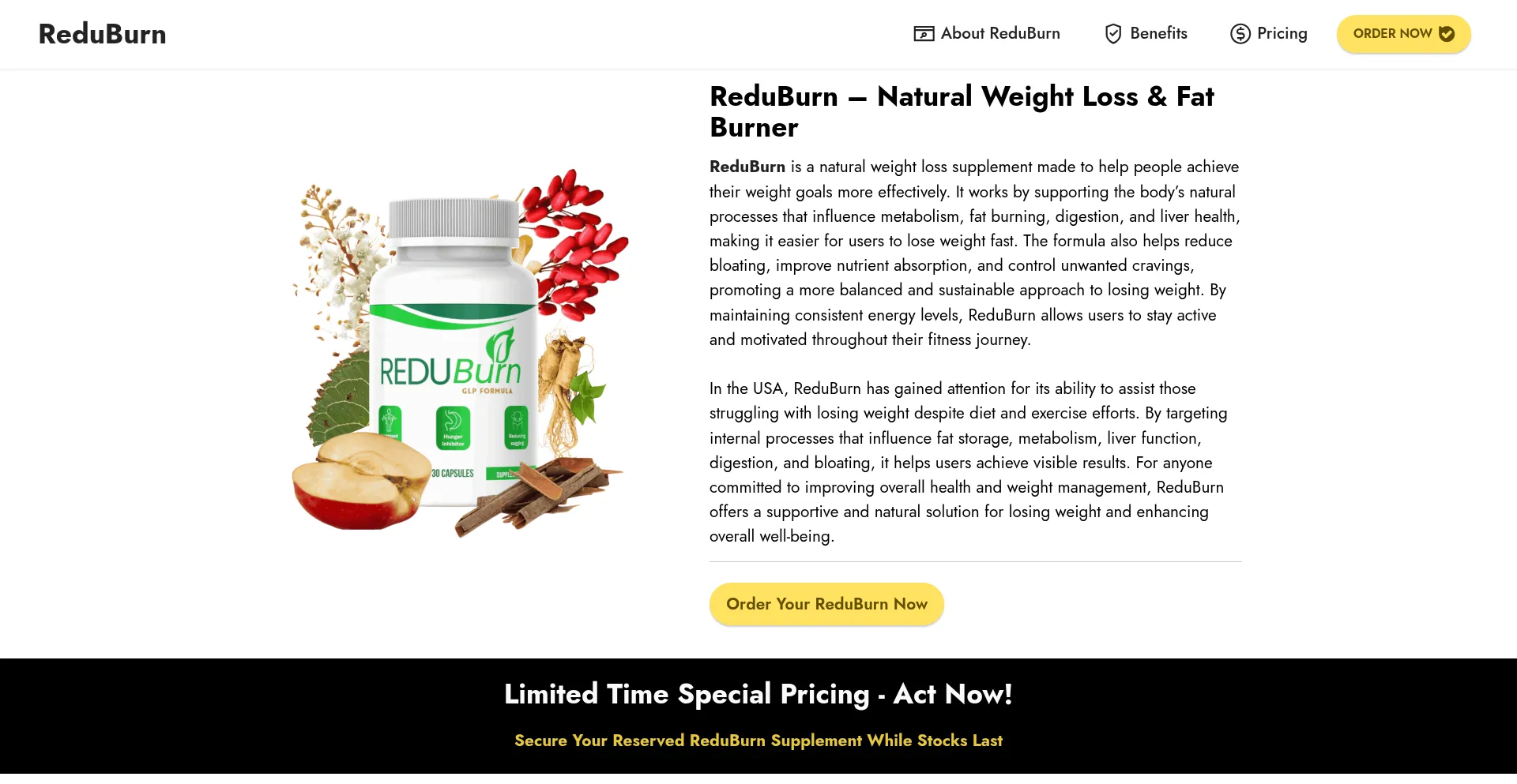 ReduBurn is a natural weight loss supplement that boosts metabolism, controls appetite, supports fat burning, and helps you lose weight fast effectively.