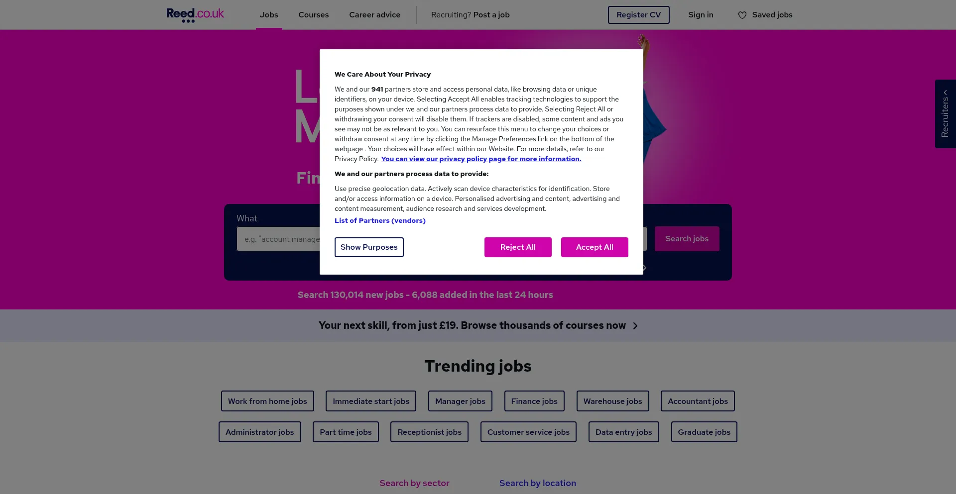 The website implements cookie consent mechanisms in compliance with privacy regulations such as GDPR or CCPA. This demonstrates that reed.co.uk adheres to data protection standards and provides users with control over personal data collection practices.