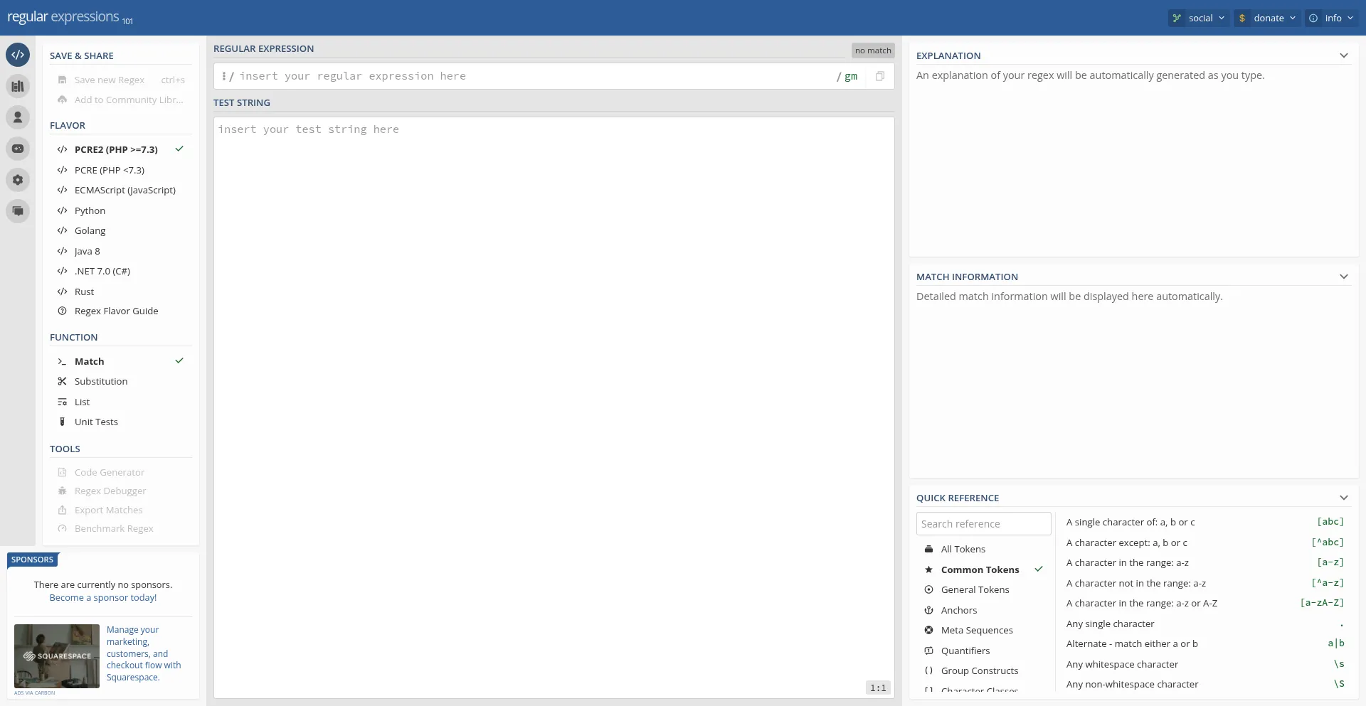 Regular expression tester with syntax highlighting, explanation, cheat sheet for PHP/PCRE, Python, GO, JavaScript, Java, C#/.NET, Rust.