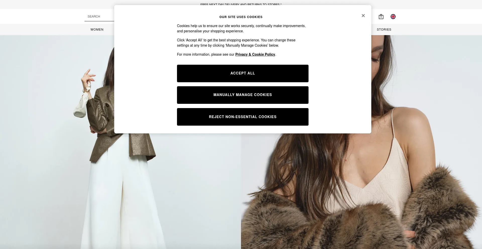 The website implements cookie consent mechanisms in compliance with privacy regulations such as GDPR or CCPA. This demonstrates that reiss.com adheres to data protection standards and provides users with control over personal data collection practices.