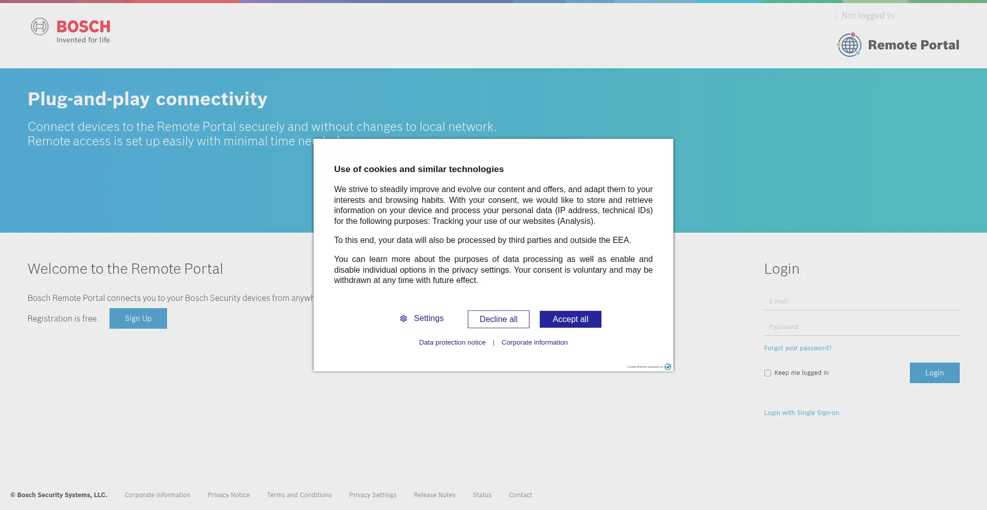 The website implements cookie consent mechanisms in compliance with privacy regulations such as GDPR or CCPA. This demonstrates that remote.boschsecurity.com adheres to data protection standards and provides users with control over personal data collection practices.
