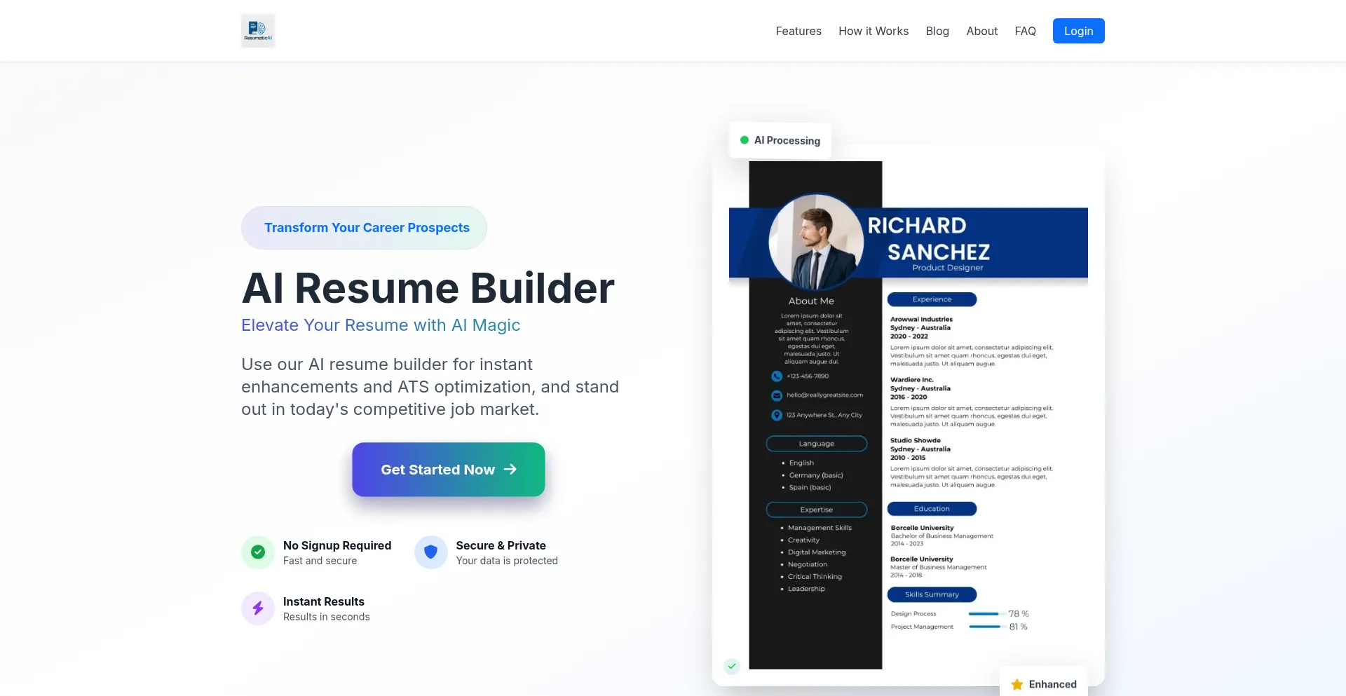 Build a job-winning resume with AI. Instant enhancements, ATS optimization, and professional formatting. Secure, no signup needed.