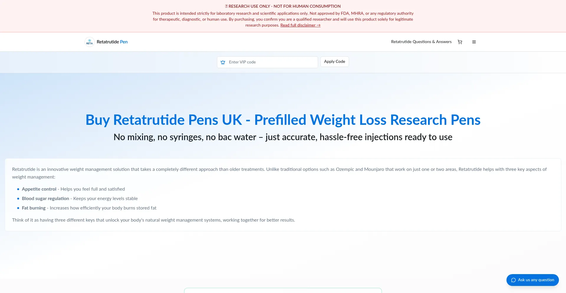 Buy prefilled Retatrutide weight loss pens in the UK. No mixing, no syringes needed. Ready-to-use research pens with needles included. Fast dispatch.