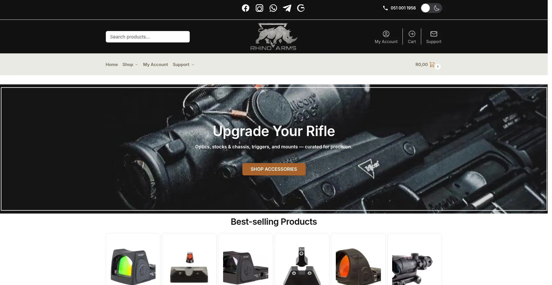 Analysis indicates that rhinoarms.co.za operates as an e-commerce platform facilitating online transactions for goods or services. The website implements shopping cart functionality, payment processing systems, and product catalog features typical of commercial retail operations.