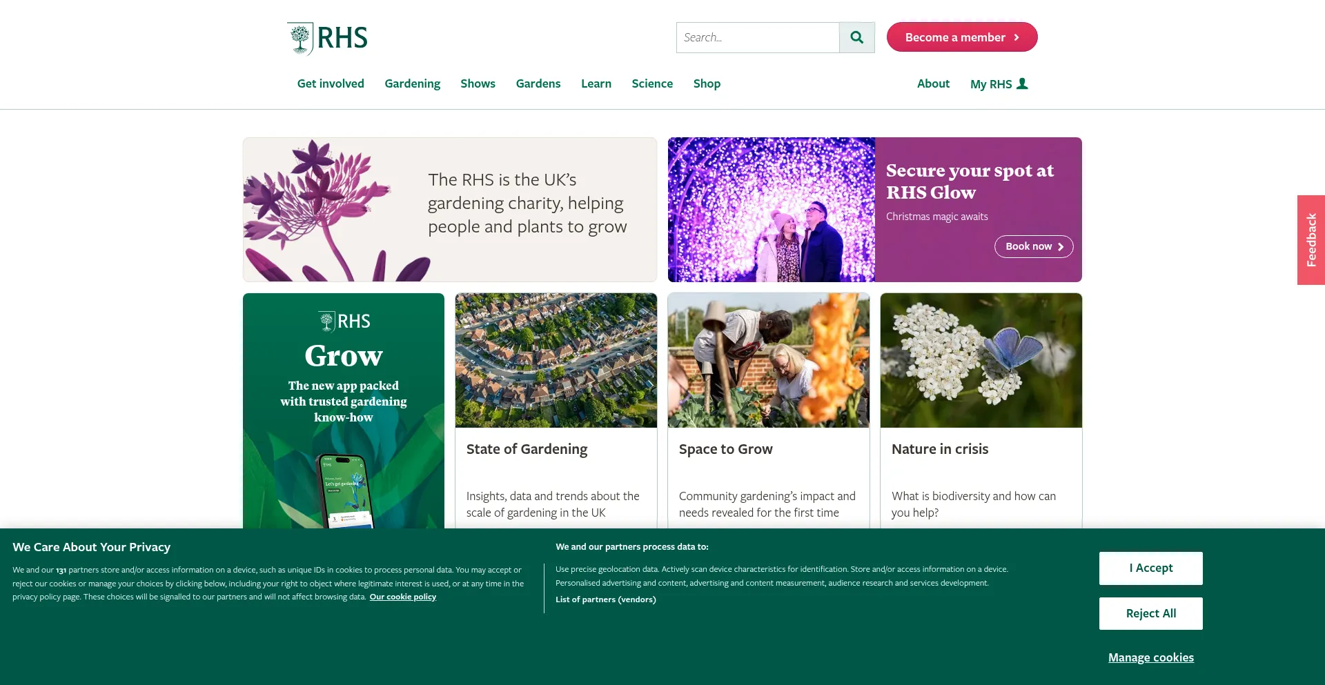 The website implements cookie consent mechanisms in compliance with privacy regulations such as GDPR or CCPA. This demonstrates that rhs.org.uk adheres to data protection standards and provides users with control over personal data collection practices.