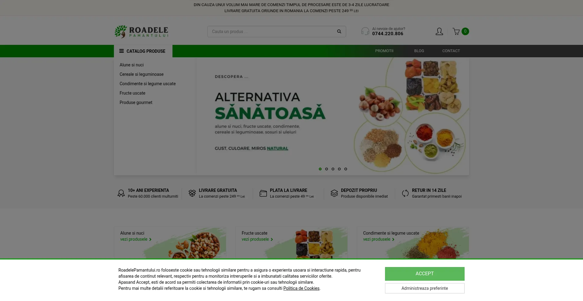 Descopera RoadelePamantului.ro: alune, cereale, condimente si fructe uscate 100% naturale. Plata la livrare sau online. Livrare rapida in Romania