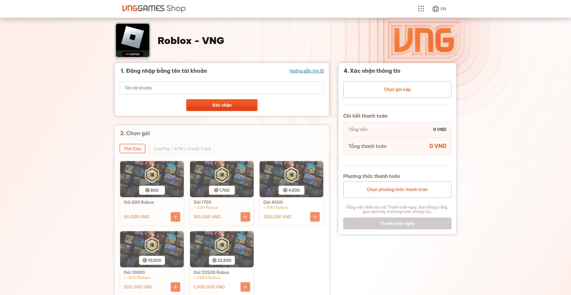 Roblox VNG | Cổng nạp chính thức của VNG | Shop.vnggames.com