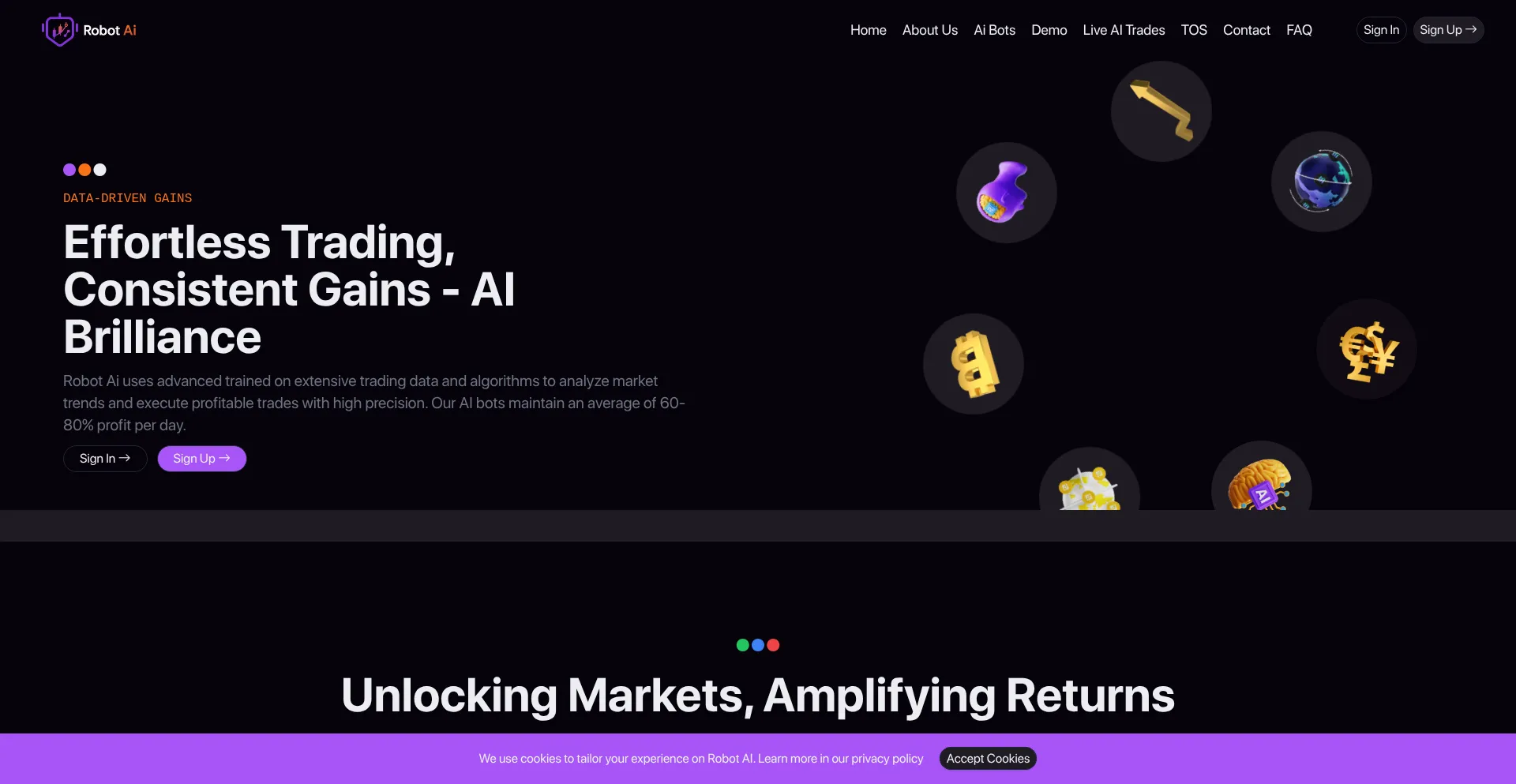 The website implements cookie consent mechanisms in compliance with privacy regulations such as GDPR or CCPA. This demonstrates that robotai.trade adheres to data protection standards and provides users with control over personal data collection practices.