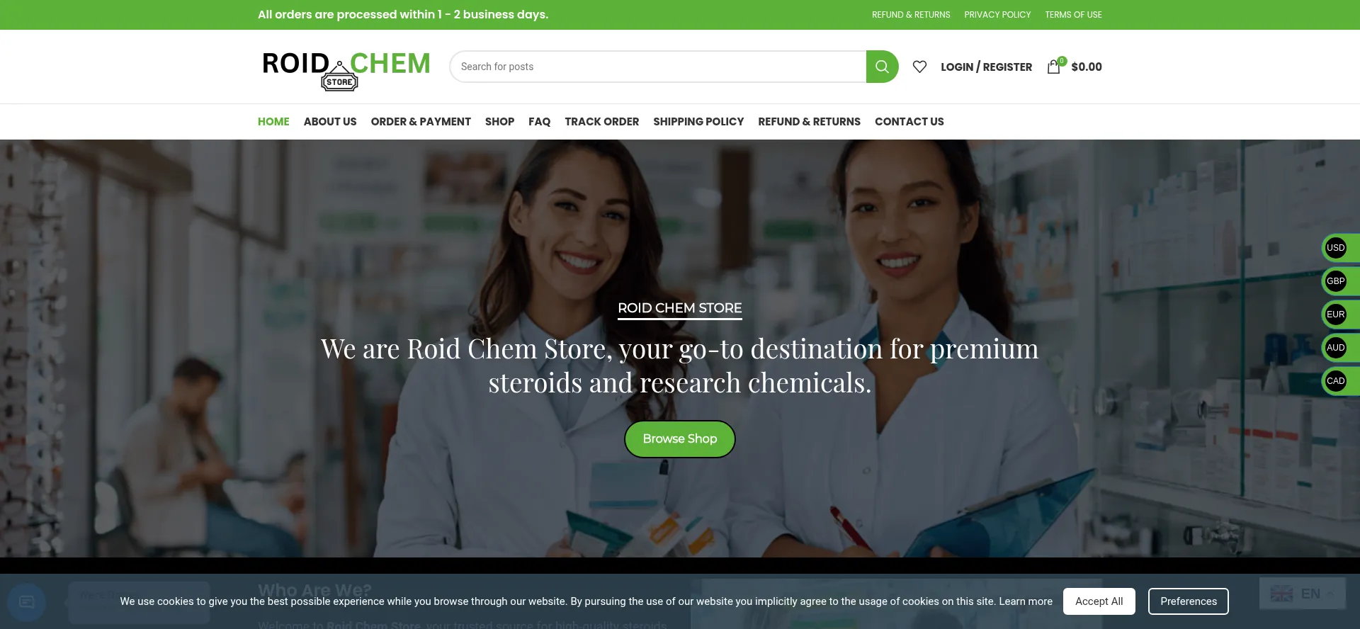 Our analyzer determines that website roidchemstore.com is using WordPress CMS. WordPress is the most popular content management system, powering over 43% of websites globally.