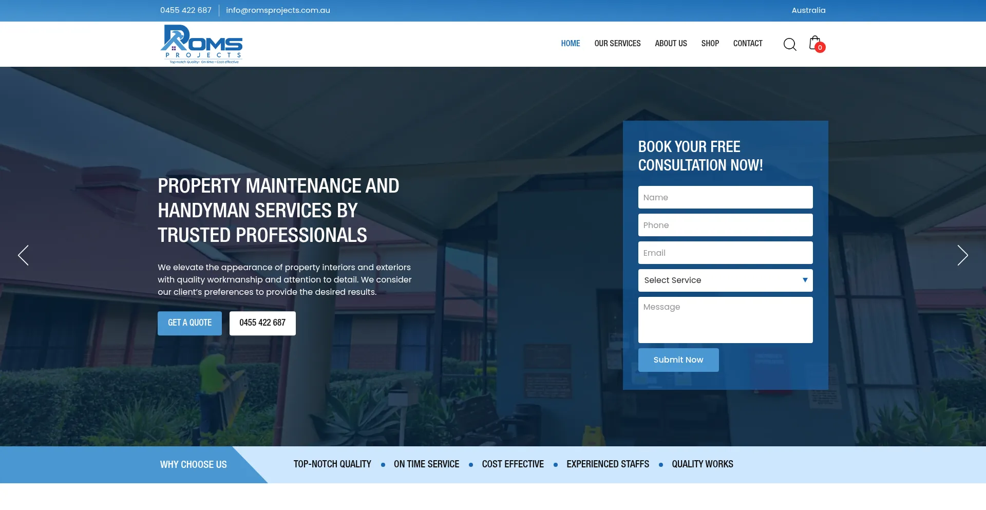 romsprojects.com.au uses Bootstrap, a widely-adopted open-source framework for responsive web development. Bootstrap enables efficient creation of mobile-friendly interfaces through standardized components and styling.