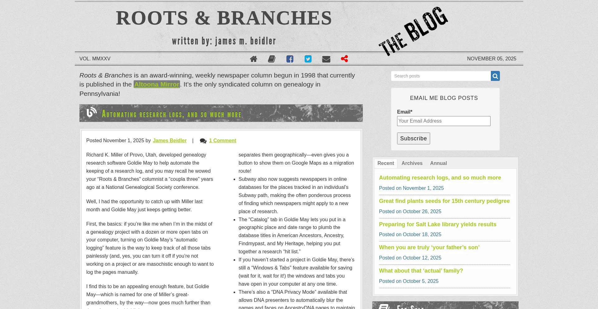 Roots & Branches - Award winning newspaper column about genealogy - The Blog
