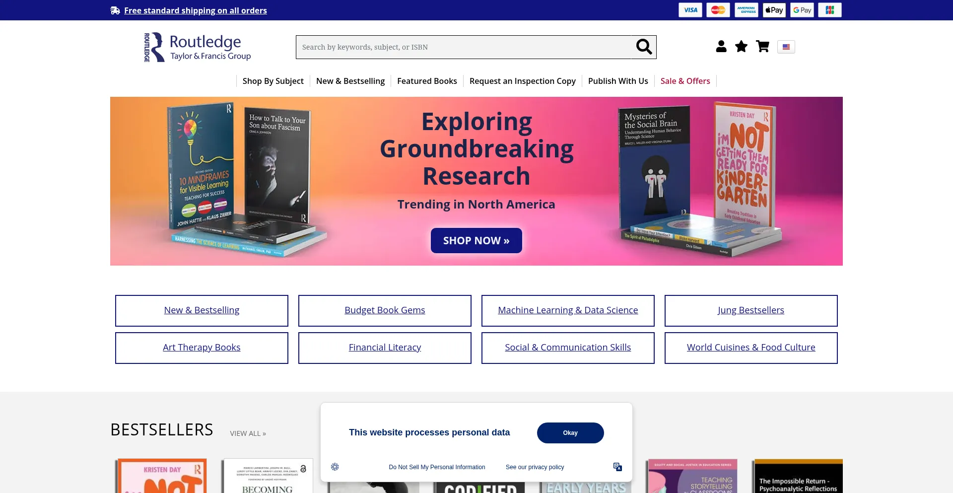 Analysis indicates that routledge.com operates as an e-commerce platform facilitating online transactions for goods or services. The website implements shopping cart functionality, payment processing systems, and product catalog features typical of commercial retail operations.