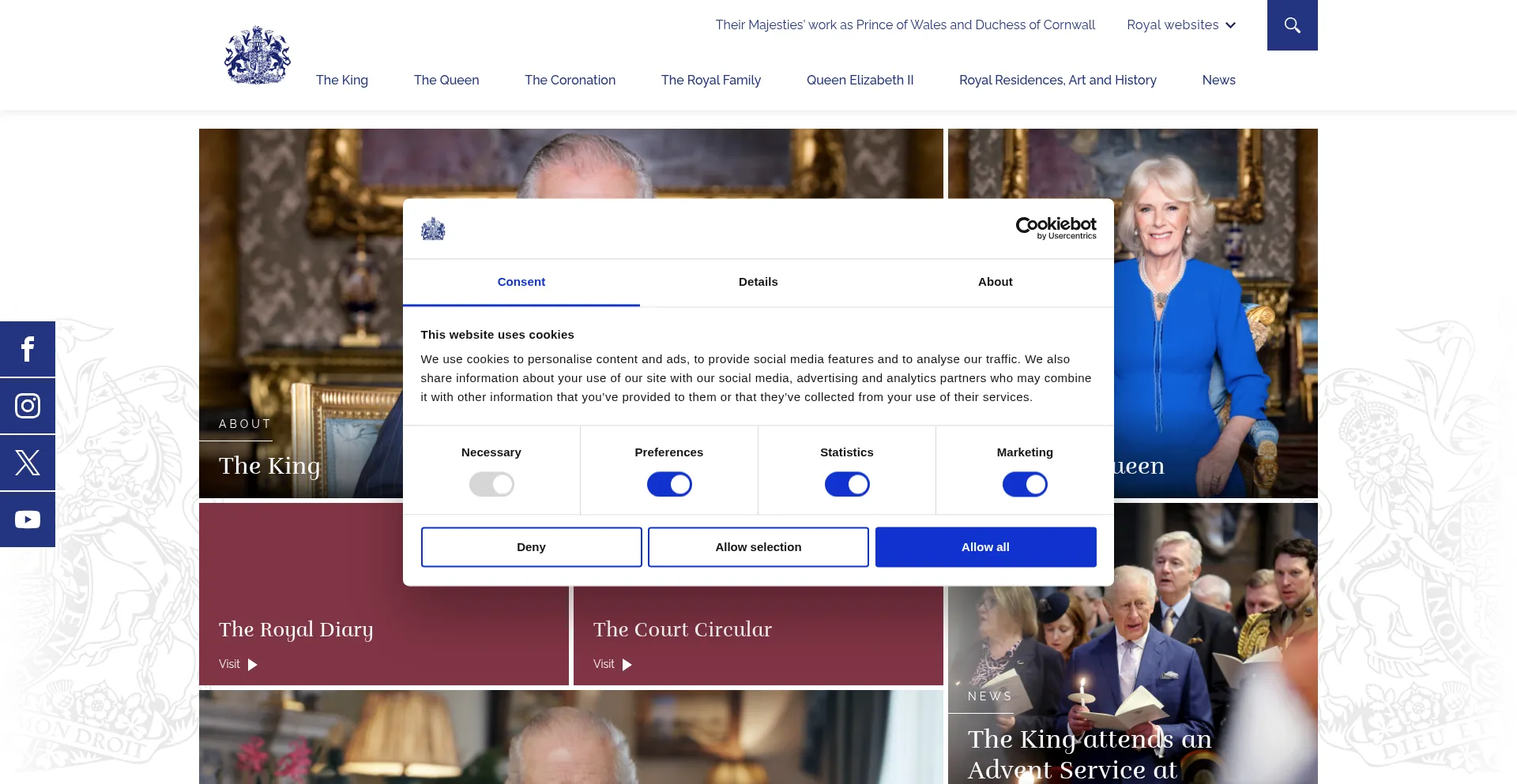 The website implements cookie consent mechanisms in compliance with privacy regulations such as GDPR or CCPA. This demonstrates that royal.uk adheres to data protection standards and provides users with control over personal data collection practices.