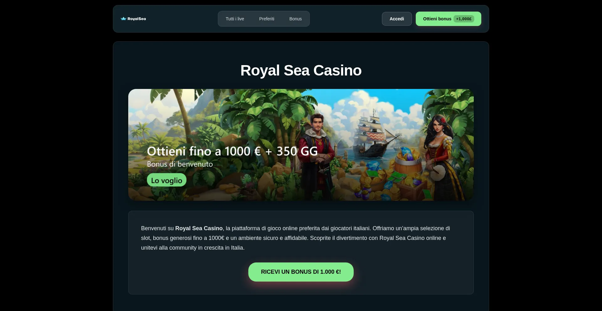 Esperienza il sito ufficiale di Royal Sea Casino per l'Italia. Ottieni bonus di benvenuto fino a 1000€ + 350 giri gratis su giochi popolari. Gioca live e vinci alla grande con...