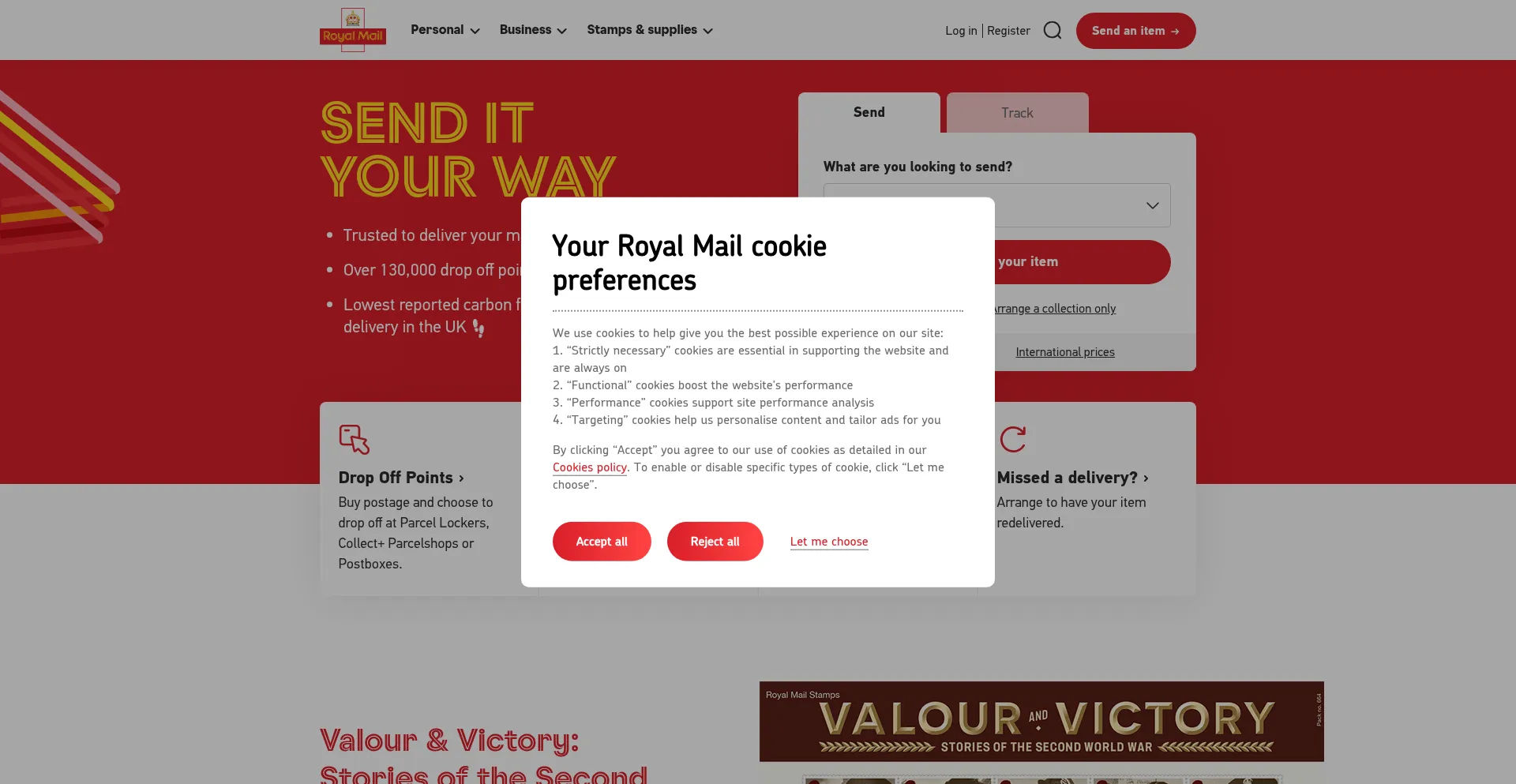 The website implements cookie consent mechanisms in compliance with privacy regulations such as GDPR or CCPA. This demonstrates that royalmail.com adheres to data protection standards and provides users with control over personal data collection practices.