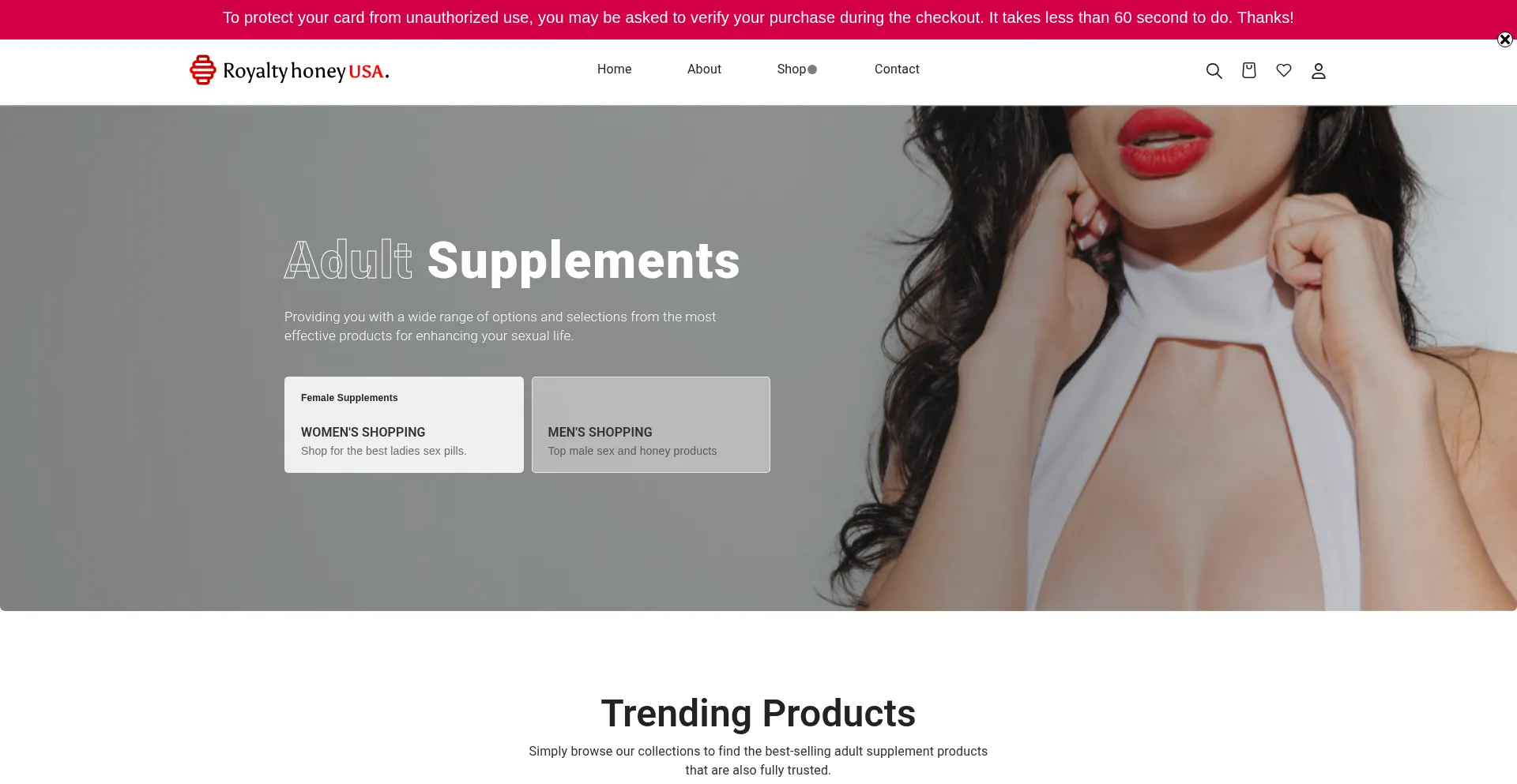 Analysis indicates that royaltyhoneyusa.com operates as an e-commerce platform facilitating online transactions for goods or services. The website implements shopping cart functionality, payment processing systems, and product catalog features typical of commercial retail operations.