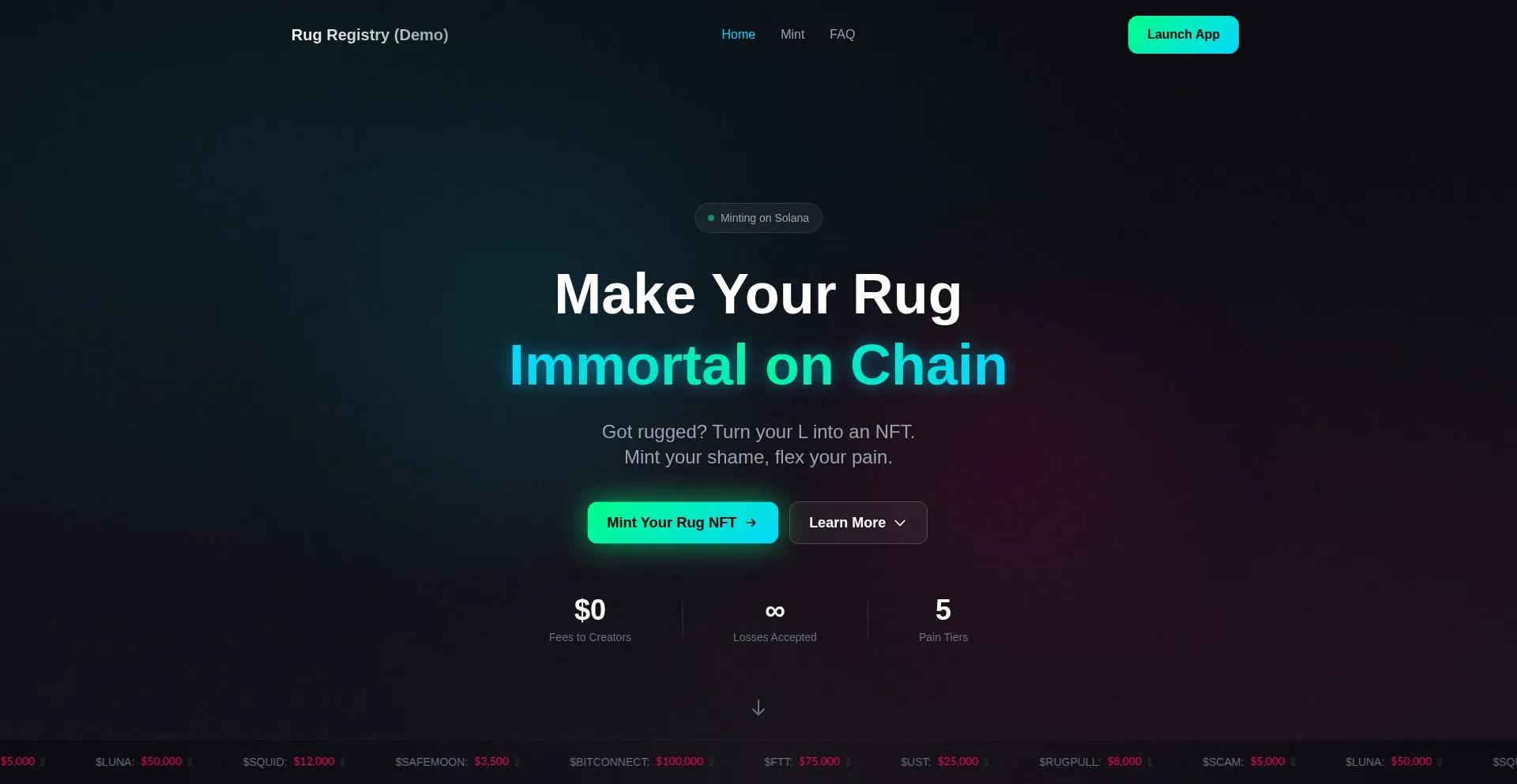 Turn your crypto rug pulls into collectible NFTs on Solana. Mint your shame, flex your pain.