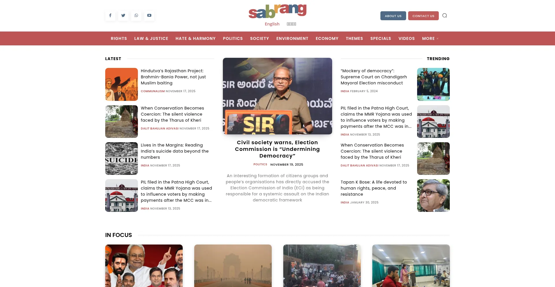 SabrangIndia website that provides a lense into journalistic narratives that are missing from the 'mainstream'. Focuses on gender, Dalit and Minority rights