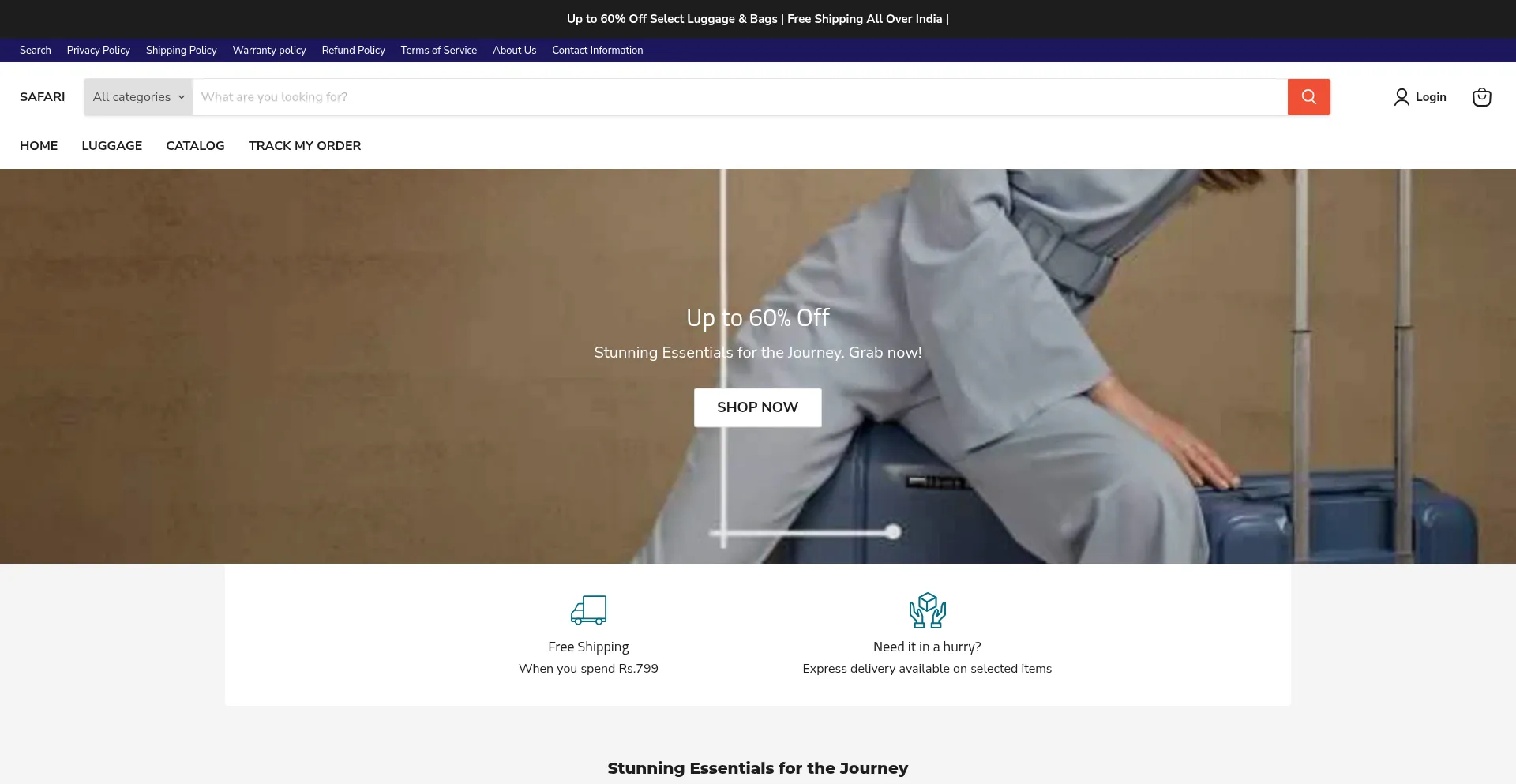 Our analyzer determines that website safaribags.online is using Shopify CMS. Shopify is a popular e-commerce platform, powering around 4.4% of websites globally.
