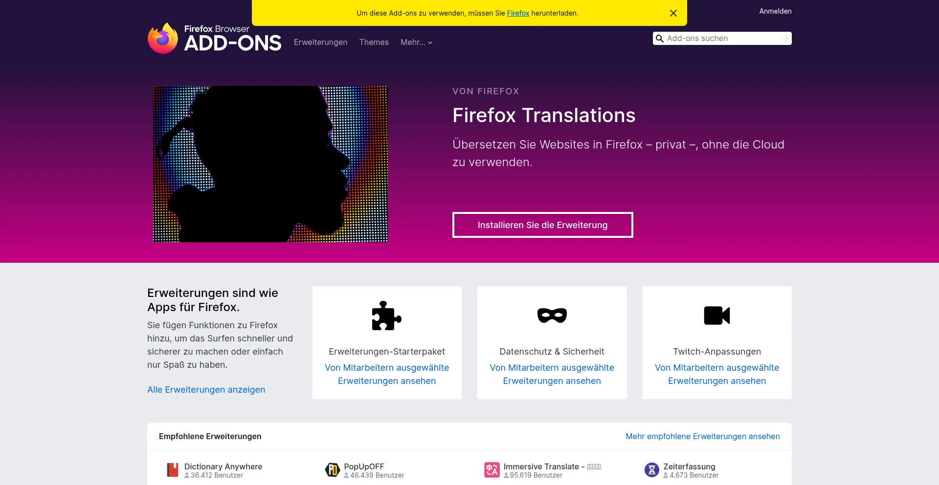 Laden Sie Firefox-Erweiterungen und -Themes herunter. Sie sind wie Apps für Ihren Browser. Sie können lästige Werbung blockieren, Passwörter schützen, das Erscheinungsbild ...