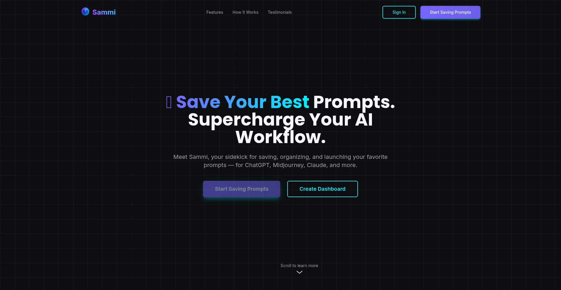 Save your best prompts. Supercharge your AI workflow with Sammi, your sidekick for saving, organizing, and launching your favorite prompts across AI platforms.