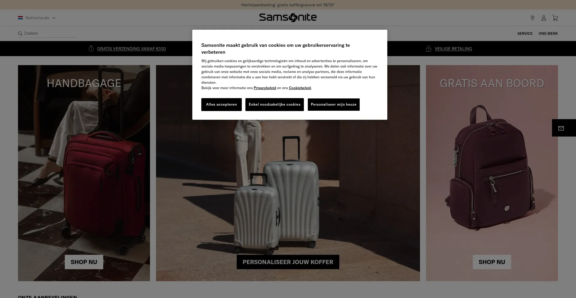 The website implements cookie consent mechanisms in compliance with privacy regulations such as GDPR or CCPA. This demonstrates that samsonite.nl adheres to data protection standards and provides users with control over personal data collection practices.