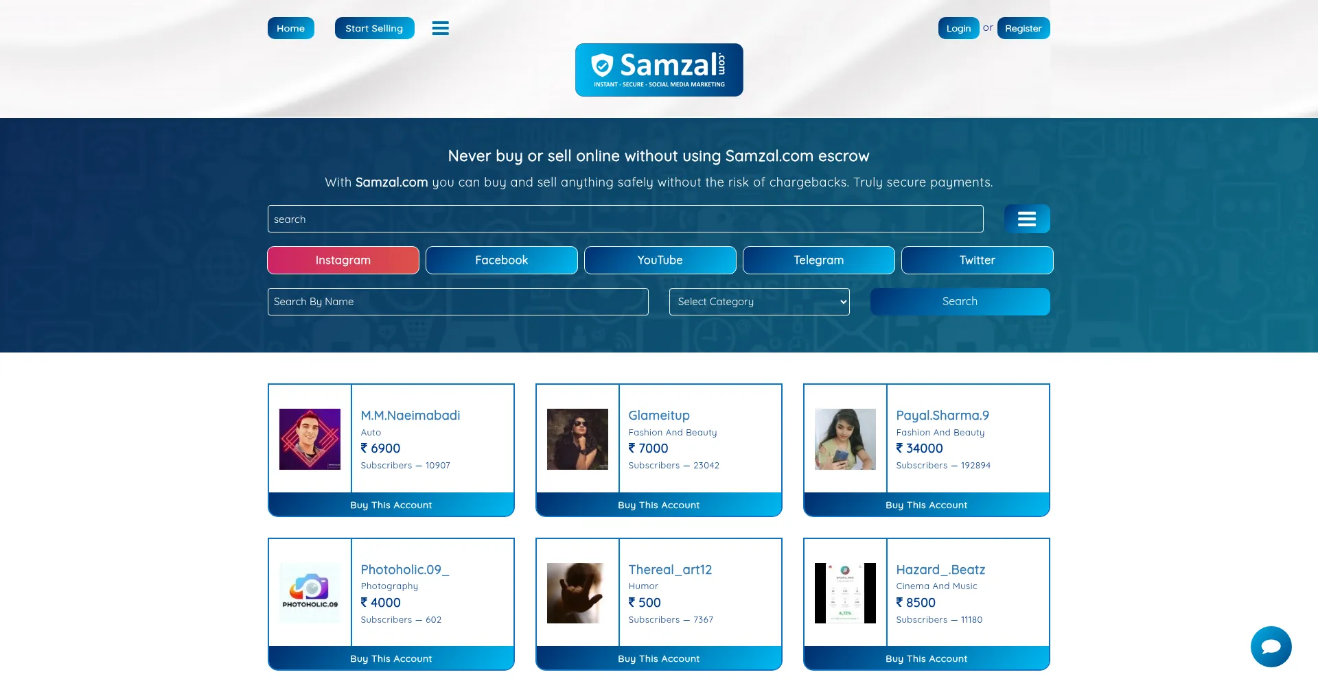 Samzal | Best site to Buy & sell Social Media Account like Instagram, Facebook, YouTube, Telegram, Twitter with verified real Followers. buy bulk Accounts.