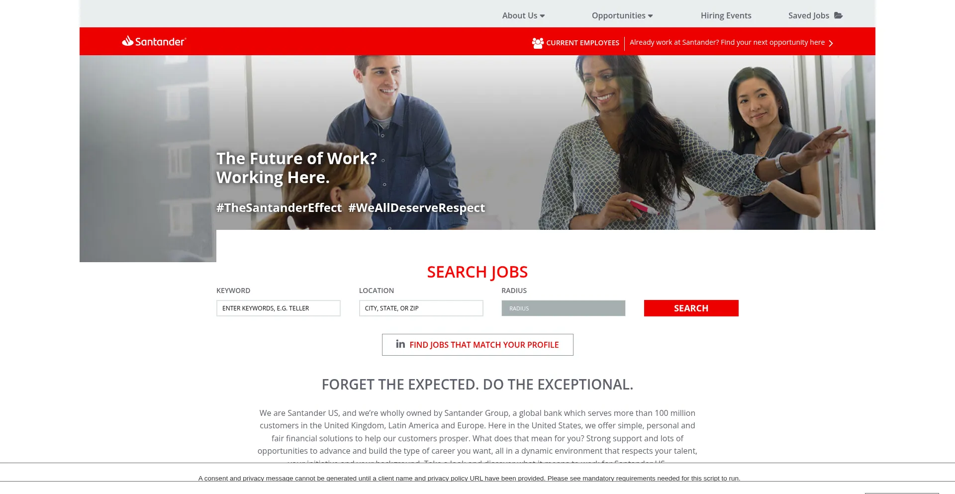 The santandercareers.com website implements data collection forms that may request personal information including names, email addresses, phone numbers, or other sensitive details. Users should verify the legitimacy of it and review privacy policies before submitting personal data.