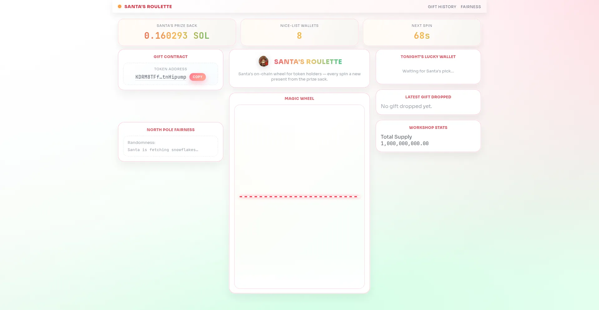 Santa's on-chain wheel for token holders — every spin a new present from the prize sack.