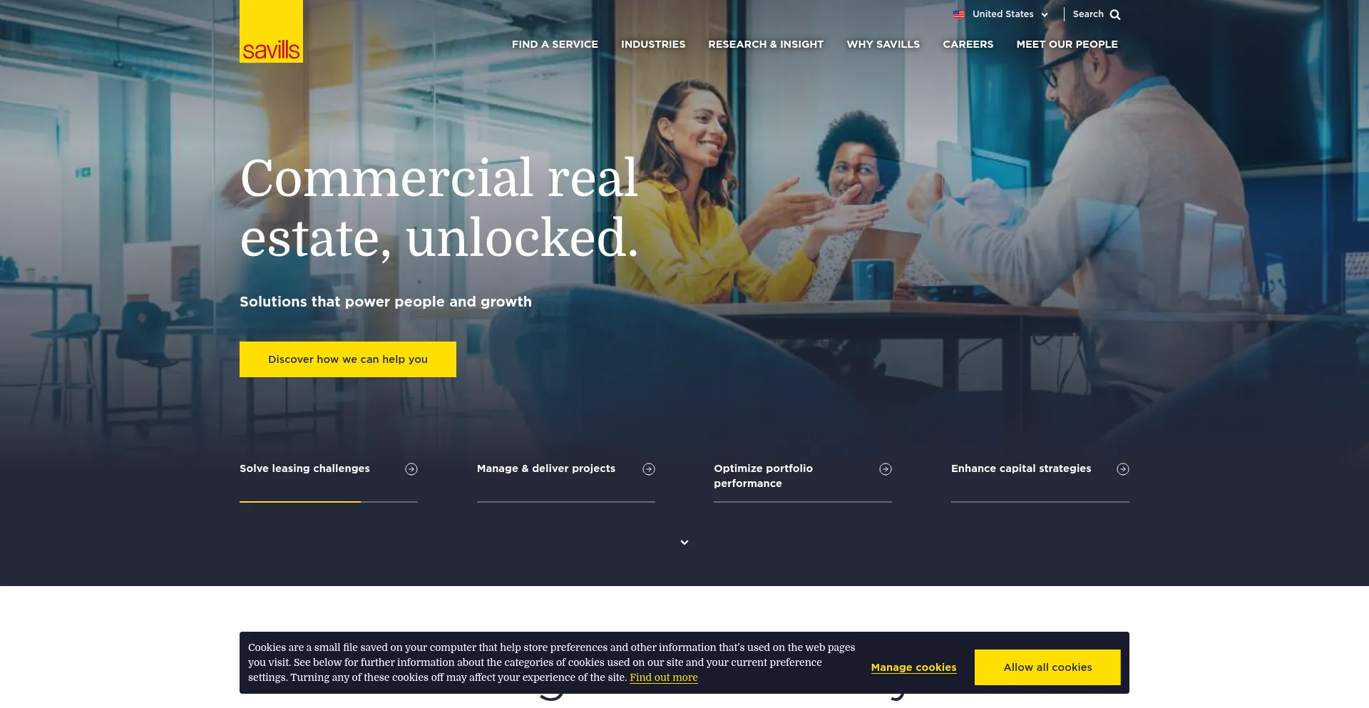 The website implements cookie consent mechanisms in compliance with privacy regulations such as GDPR or CCPA. This demonstrates that savills.us adheres to data protection standards and provides users with control over personal data collection practices.