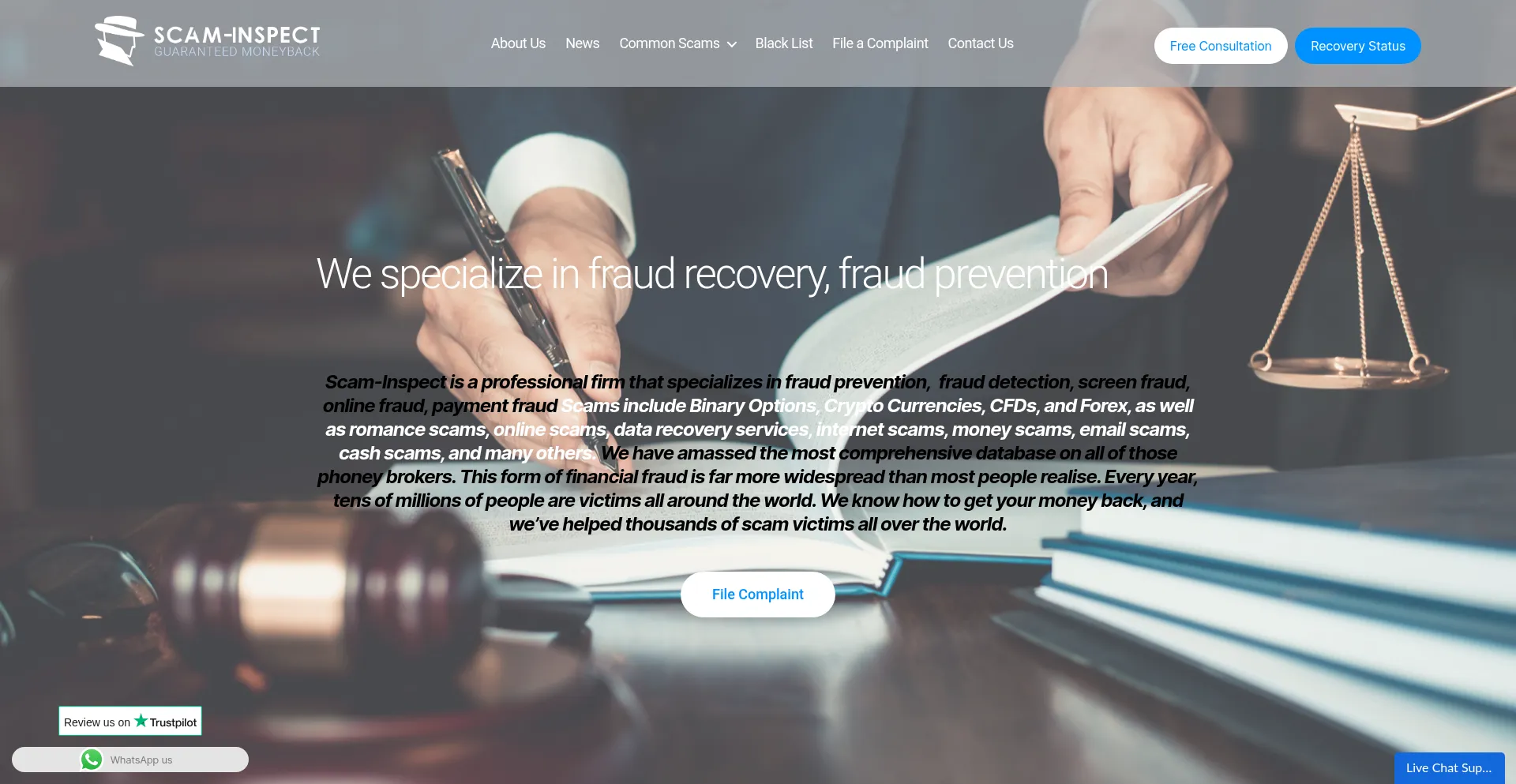 The website scaminspect.com advertises fund recovery services for lost or stolen assets. While some operate on contingency fee structures, others may require upfront payments, which can indicate fraudulent operations. Verify credentials and regulatory compliance before engaging such services.