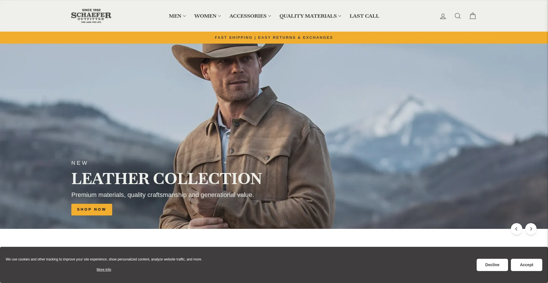 The website implements cookie consent mechanisms in compliance with privacy regulations such as GDPR or CCPA. This demonstrates that schaeferoutfitter.com adheres to data protection standards and provides users with control over personal data collection practices.