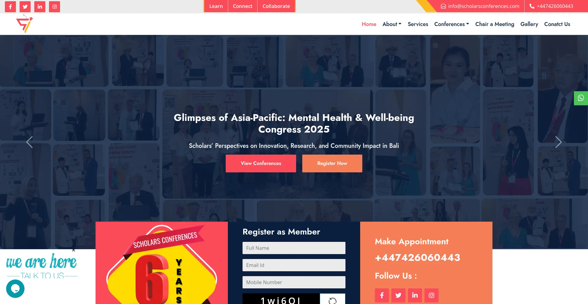 Analysis reveals that scholarsconferences.com displays social media icons or links that do not connect to legitimate social media profiles. This deceptive practice is commonly employed to create false legitimacy and represents a significant indicator of fraudulent intent requiring immediate caution.