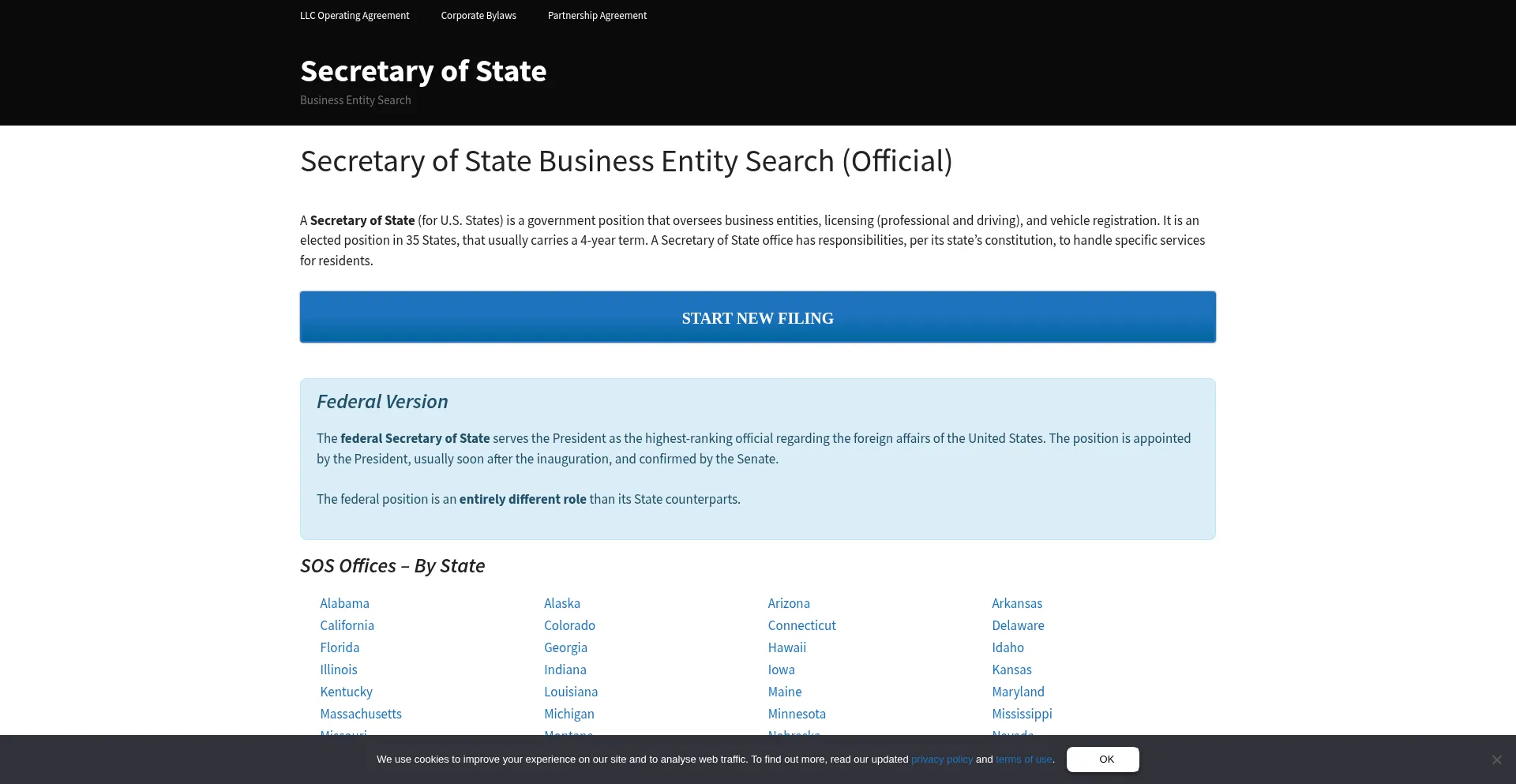 The secretaryofstate.com website implements data collection forms that may request personal information including names, email addresses, phone numbers, or other sensitive details. Users should verify the legitimacy of it and review privacy policies before submitting personal data.