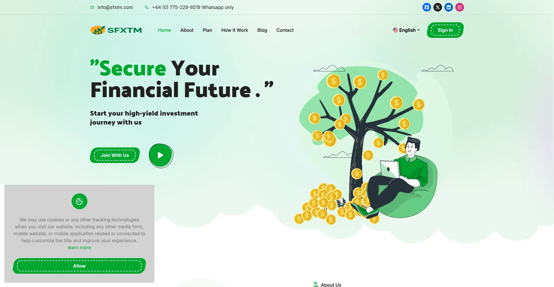 Analysis reveals that sfxtm.com displays social media icons or links that do not connect to legitimate social media profiles. This deceptive practice is commonly employed to create false legitimacy and represents a significant indicator of fraudulent intent requiring immediate caution.