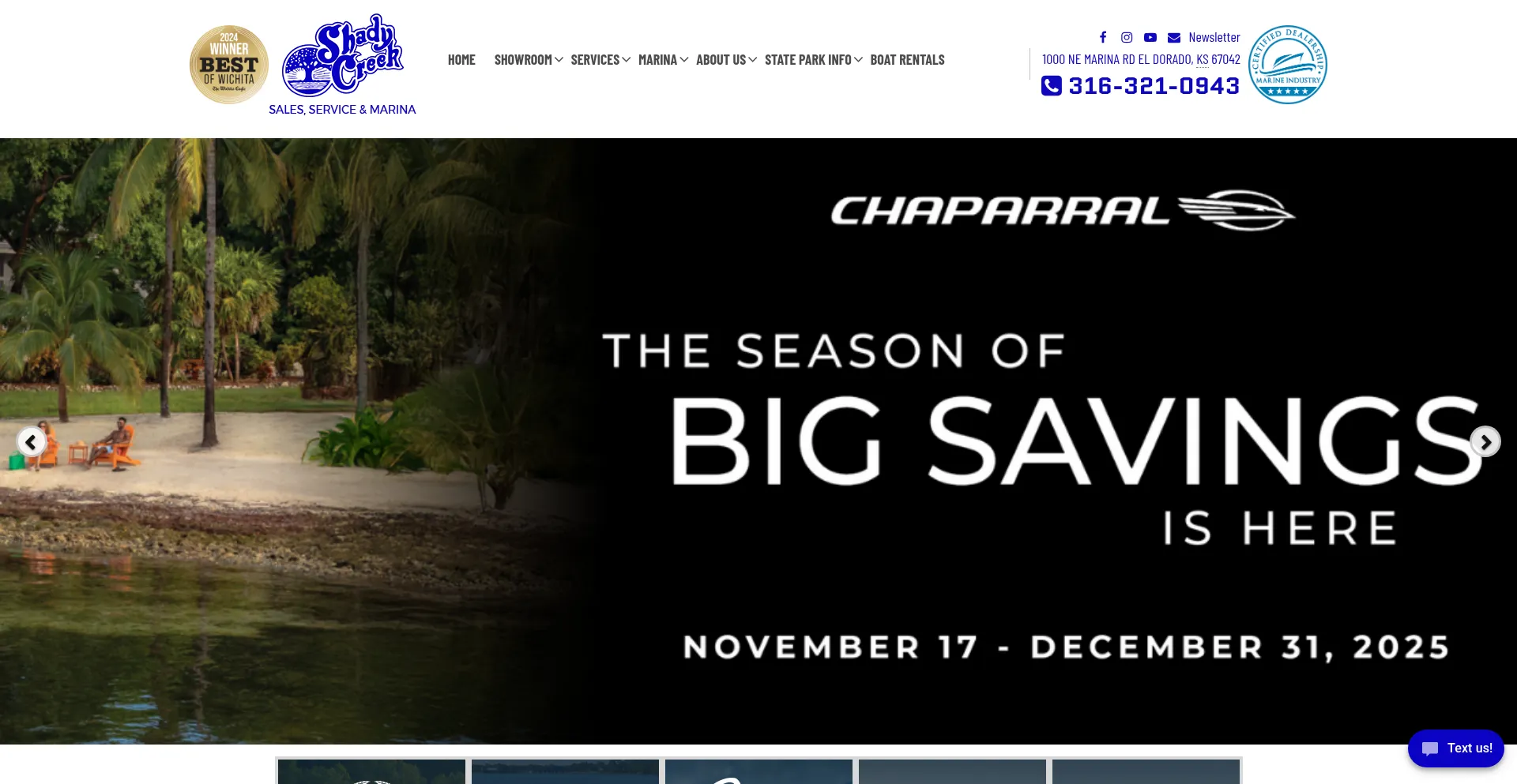 Shady Creek Marina Sales & Service is a boat dealership located 25 miles North East of Wichita, Kansas, on El Dorado Lake. We sell new and used boats from Cobalt Boats, Chaparr...