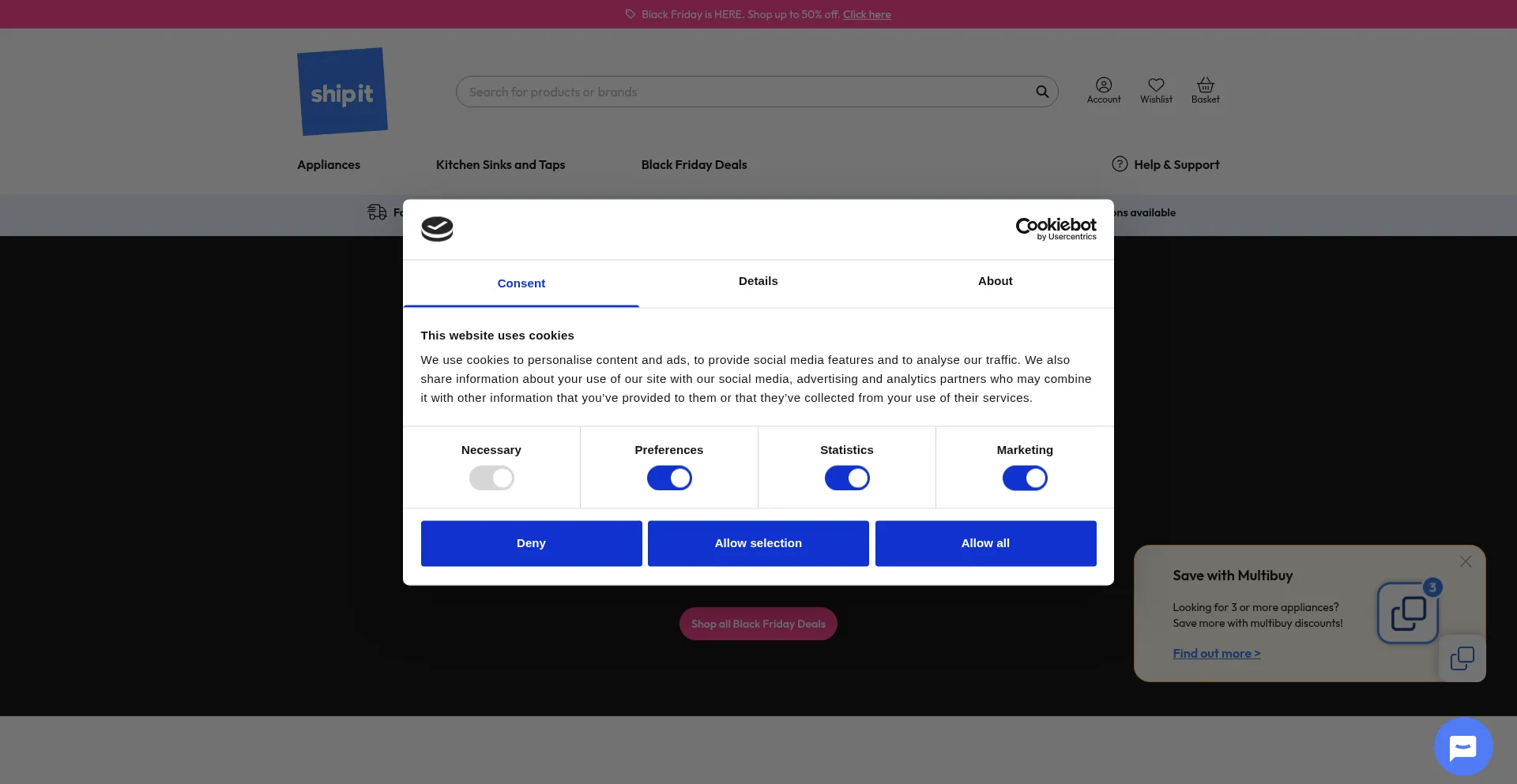 The website implements cookie consent mechanisms in compliance with privacy regulations such as GDPR or CCPA. This demonstrates that shipitappliances.co.uk adheres to data protection standards and provides users with control over personal data collection practices.
