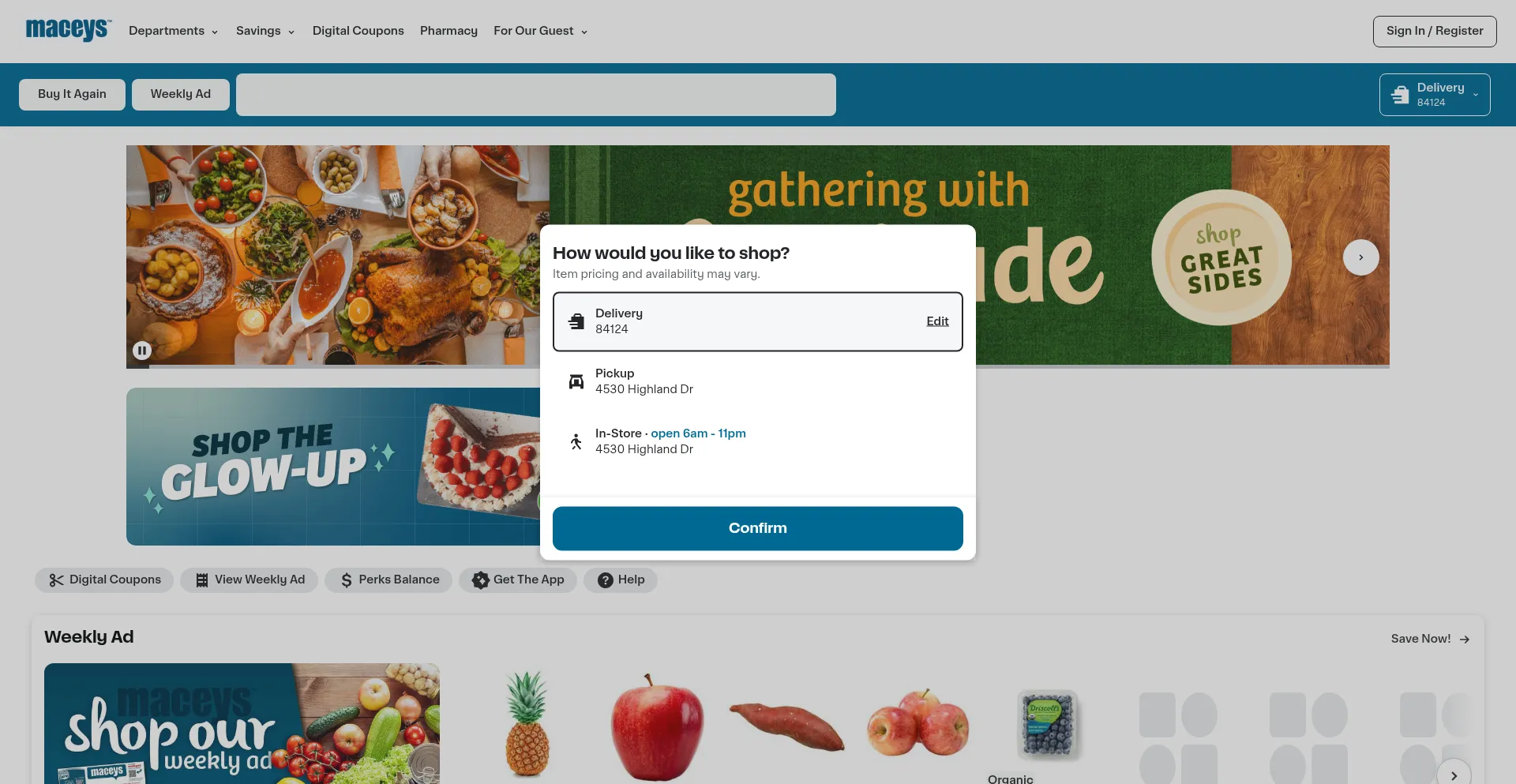 Macey's same-day delivery or curbside pickup <b>in as fast as 1 hour</b> with Macey's. Your first delivery or pickup order is free! Start shopping online now with Macey's to get...