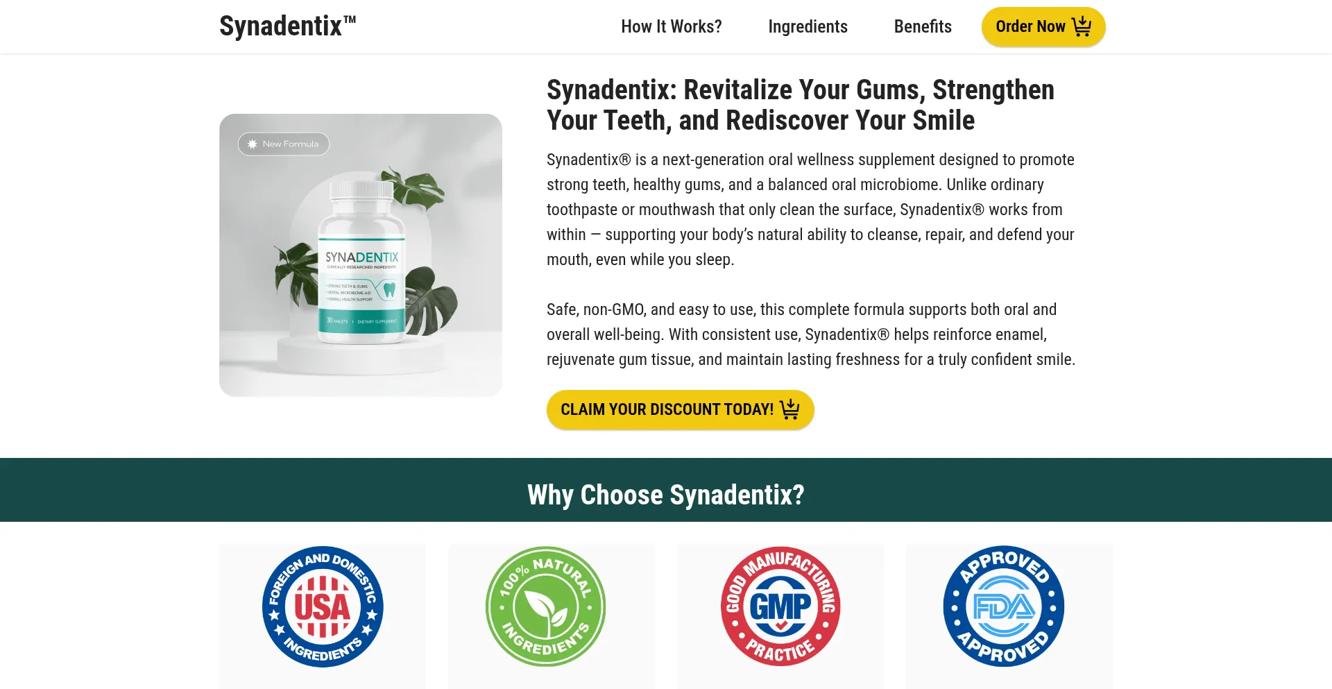 Support your dental health with Synadentix™. This natural formula nourishes gums, strengthens teeth, and promotes a healthy, bacteria-free mouth. Buy now.