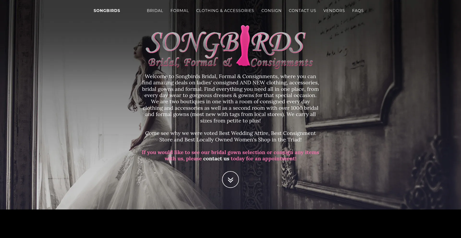 Welcome to Songbirds Bridal, Formal & Consignments, where you can find amazing deals on ladies' consigned AND NEW clothing, accessories, bridal gowns and formal.