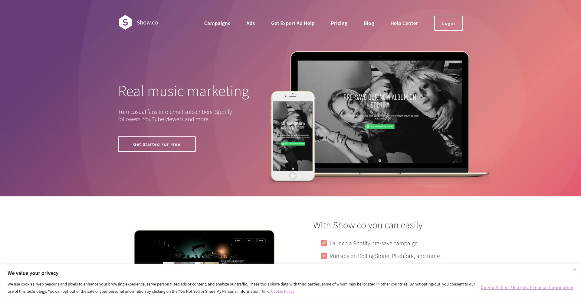 Build your audience with Show.co. Launch a Spotify pre-save campaign. Reach fans with Spotify audio ads. Premiere a new video on YouTube. Grow your Spotify follower and build an...