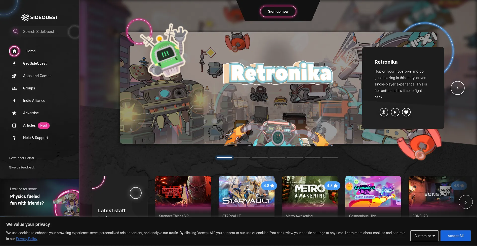 Welcome to SideQuest, the ultimate VR discovery platform and home to VRs greatest hits, indie gems, sideloadonly and earlyaccess VR content—and much more. SideQuest is also pa...