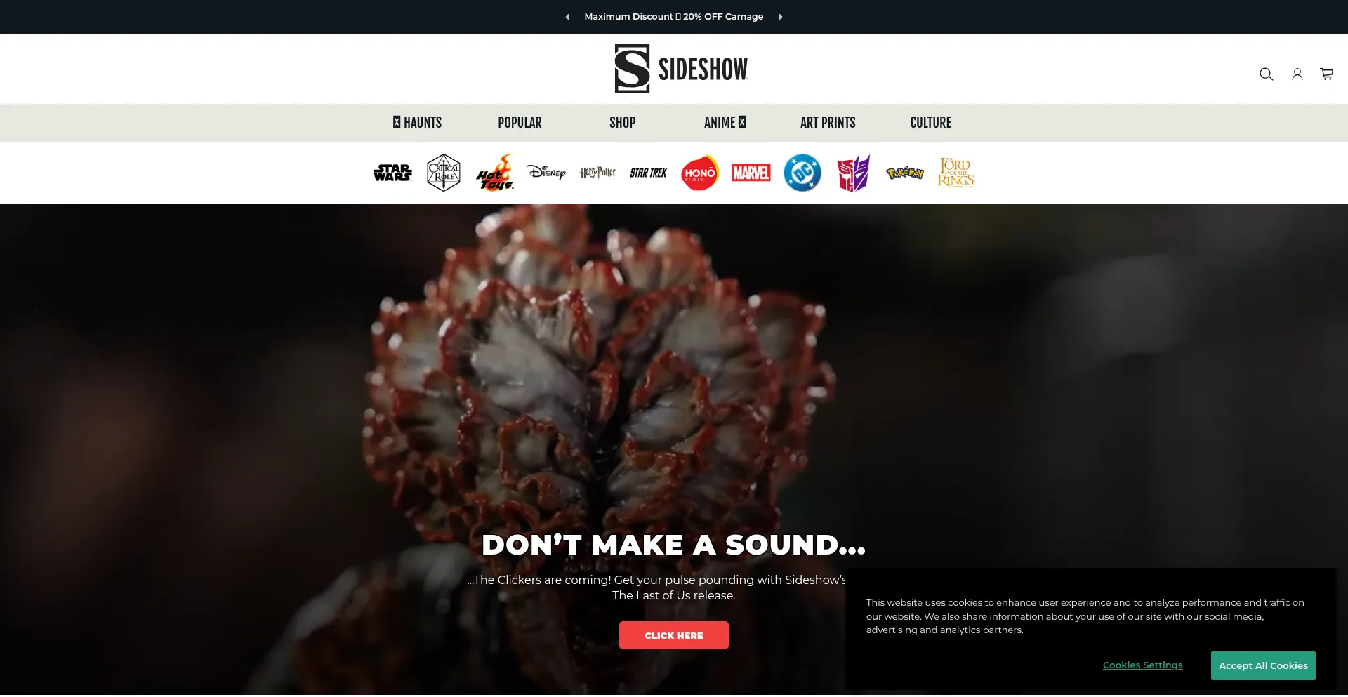 The website implements cookie consent mechanisms in compliance with privacy regulations such as GDPR or CCPA. This demonstrates that sideshow.com adheres to data protection standards and provides users with control over personal data collection practices.