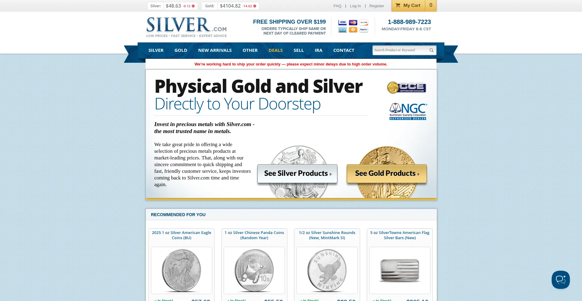 Buy Silver, Gold, and Copper bullion online at Silver.com - the bullion market leader. Fast & secure shipping. Call us at 888-989-7223.