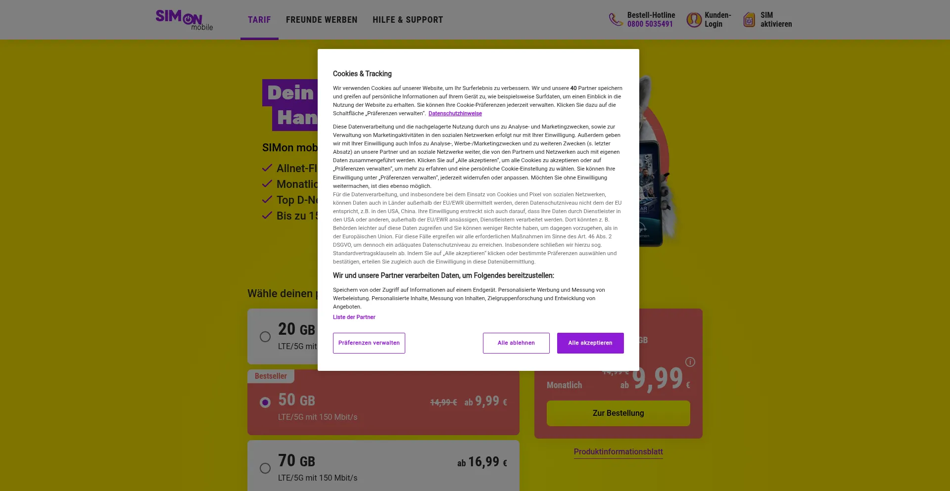 The website implements cookie consent mechanisms in compliance with privacy regulations such as GDPR or CCPA. This demonstrates that simonmobile.de adheres to data protection standards and provides users with control over personal data collection practices.