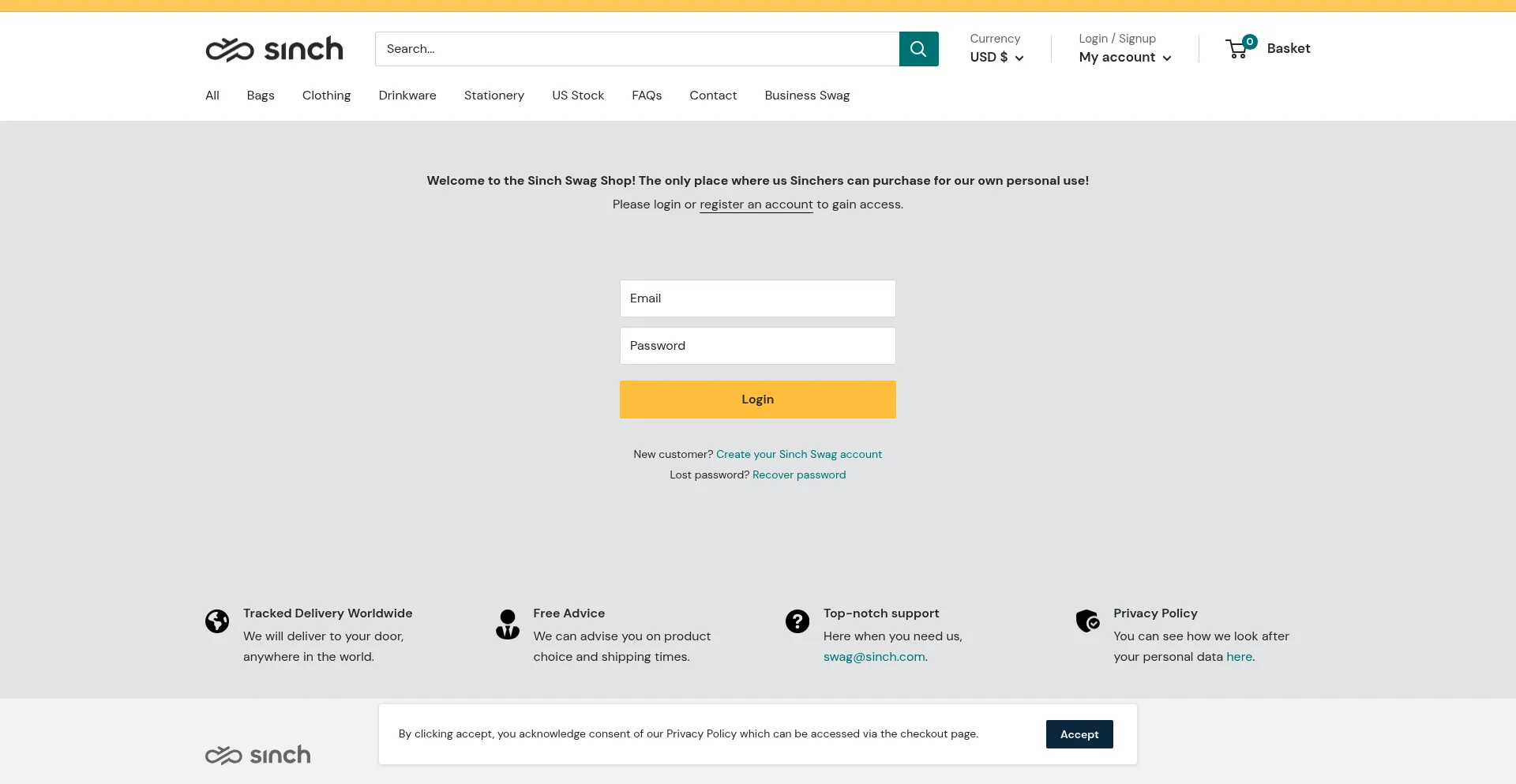 Analysis indicates that sinch-swag.com operates as an e-commerce platform facilitating online transactions for goods or services. The website implements shopping cart functionality, payment processing systems, and product catalog features typical of commercial retail operations.