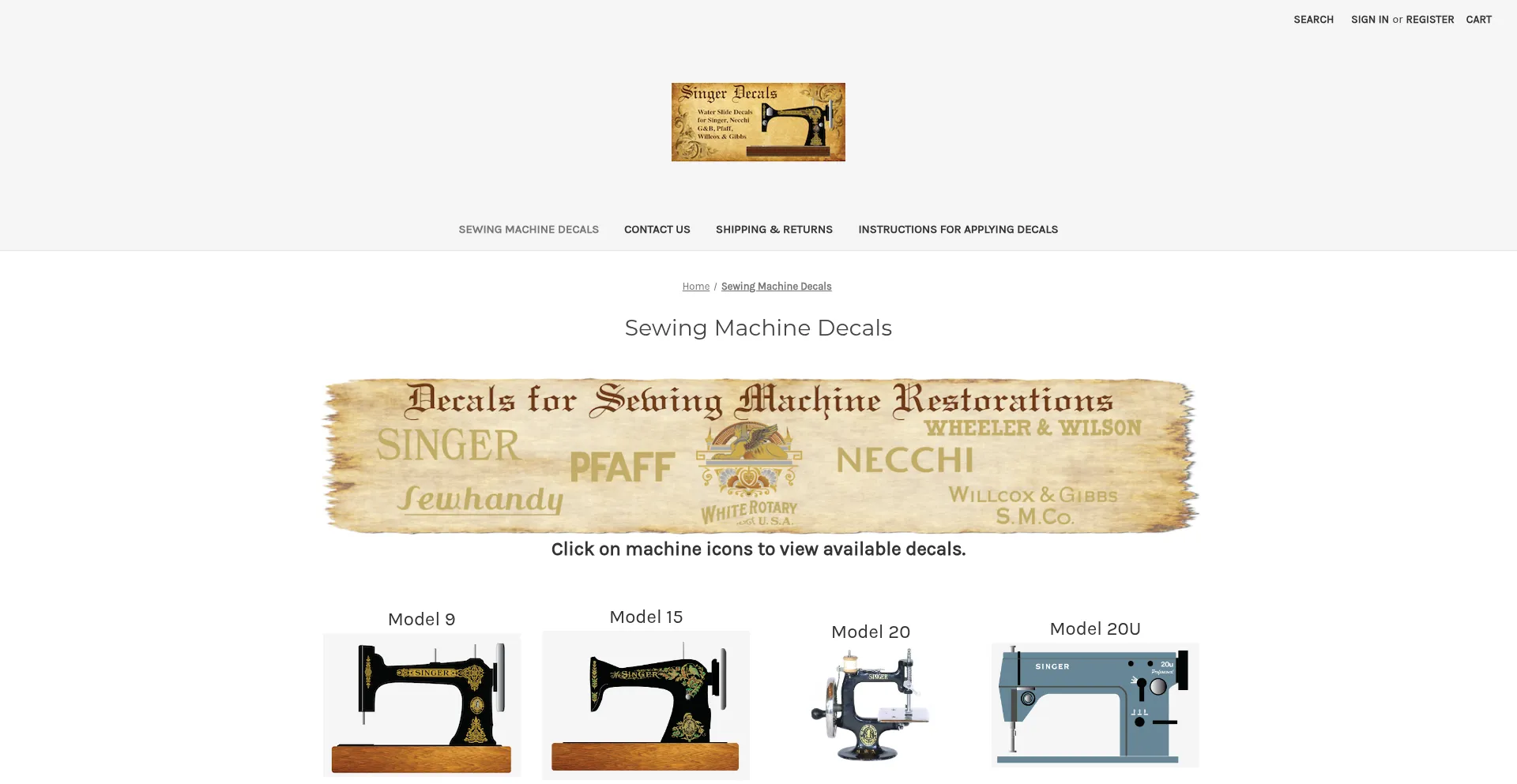 Analysis indicates that singerdecals.com operates as an e-commerce platform facilitating online transactions for goods or services. The website implements shopping cart functionality, payment processing systems, and product catalog features typical of commercial retail operations.
