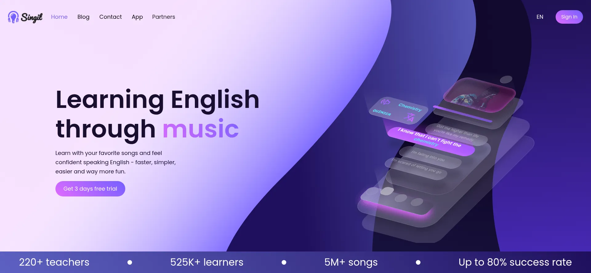 Singit can teach you English using music and songs. Based on psychological researches, learning through music removes the difficulties.