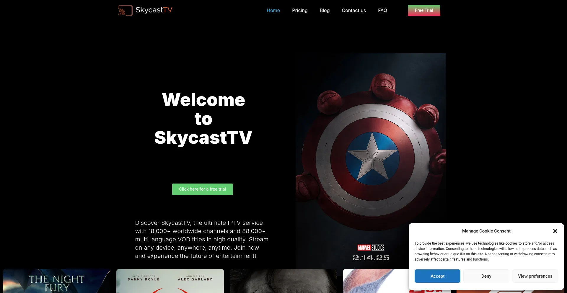 Home Pricing Blog Contact us FAQ Hamburger Toggle Menu Free Trial Welcome to SkycastTV Click here for a free trial Discover SkycastTV, the ultimate IPTV service with 18,000+ wor...
