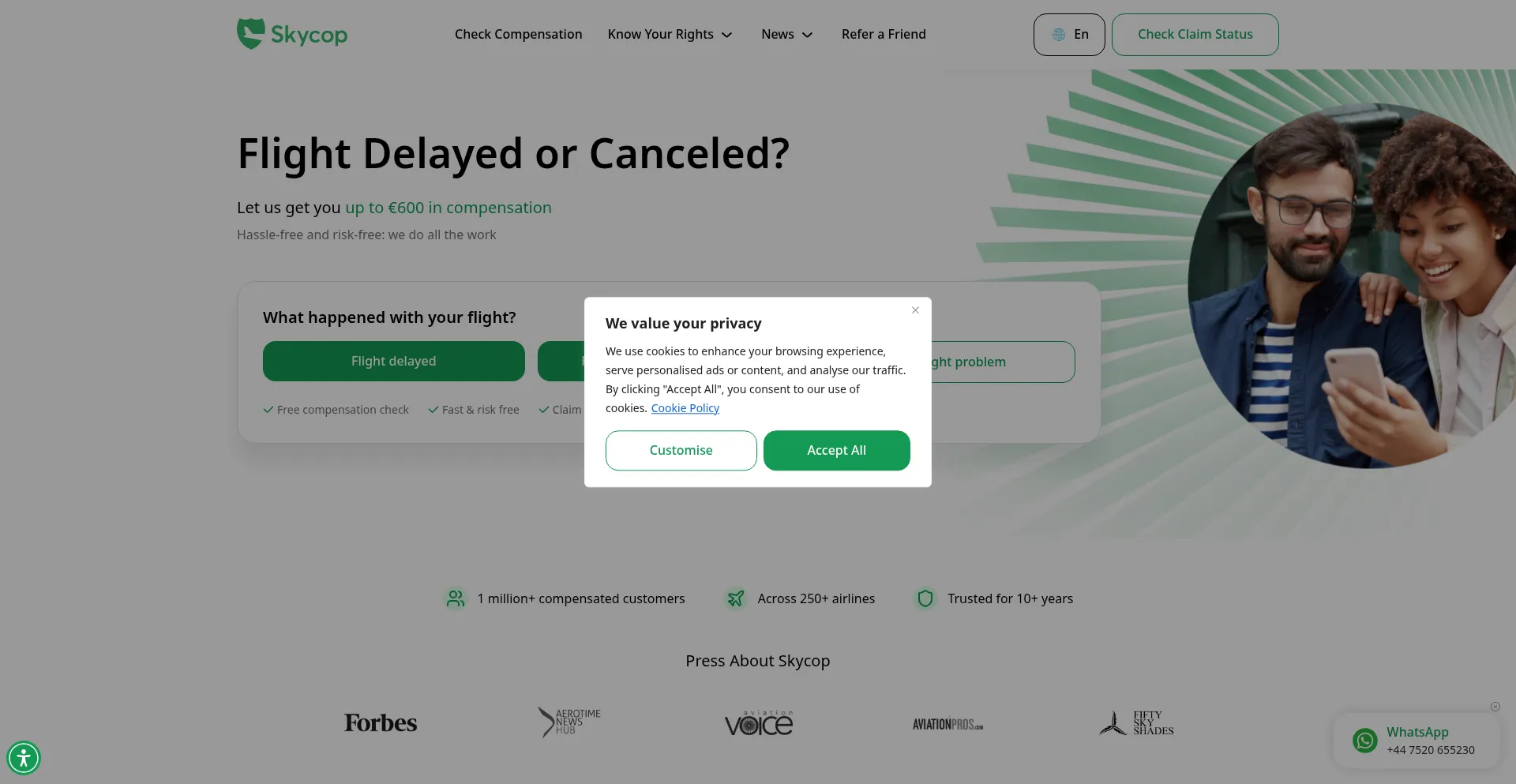 Skycop enforce your right to claim compensation in case of flight delay or cancellation. Receive up to €600 for flight disruptions.